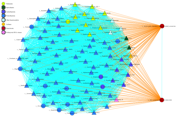 计算生物与医学生态课题组李文迪为博士为本文第一作者,马占山研究员为本文通讯作者。该研究受到国家自然科学基金委的资助。文章链接:https://link.springer.com/article/10.1007/s00248-022-02148-9 (下图中:最右上边网络节点代表新冠病毒,右下边节点即为前文提到的2007年最早在保加利亚发现的蝙蝠病毒,两者之间的天蓝色连线代表两者之间“协作”关系, 它们与其它微生物之间关系为拮抗关系、以橘黄色连线标示)。
