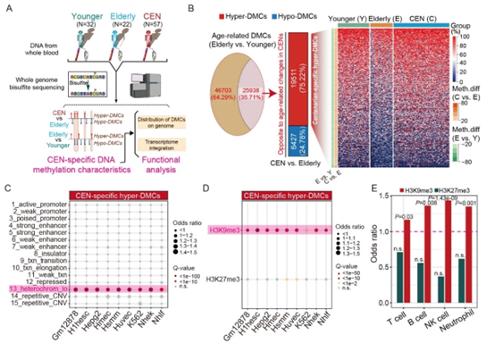 健康长寿/老化是遗传因素和环境因素共同作用的结果,遗传因素约占15%-35%。表观遗传学是连接环境与遗传的桥梁,其中DNA甲基化是研究最为广泛的表观修饰之一,与衰老及老年病发生关系密切。早期,甲基化DNA免疫共沉淀测序(MeDIP-seq)、Illumina 450K DNA甲基化芯片等技术已被用于探索长寿老人的DNA甲基化模式,但这些技术存在明显的覆盖偏差,仅主要覆盖启动子、基因体、增强子等区域。然而,研究表明,人类基因组绝大多数区域都是有功能的。鉴于此,E乐彩孔庆鹏团队,联合海南医学院蔡望伟团队,利用全基因组DNA甲基化测序技术(WGBS)构建了海南省57例百岁老人(年龄:102.2 ± 2.6岁)、22例高龄老人(年龄:74.0 ± 2.7岁)和32例一般老人(年龄:57.9 ± 5.0岁)外周血样本高覆盖、无偏差的单碱基分辨率甲基化图谱。该数据覆盖了人类基因组2360余万(>84%)个CpG位点。进一步分析发现,较高龄老人,百岁老人存在大量的特异高甲基化位点(较一般老人,这些位点在高龄老人中甲基化水平降低),且显著富集于以H3K9me3修饰为标志的组成型异染色质区域。异染色质丢失是衰老的重要驱动力,而高甲基化有助于维持染色质稳定。此外,分析匹配样本的转录组数据,发现百岁老人这些高甲基化的H3K9me3区域转座子倾向低表达,且许多老年病基因低表达。综上所述,该研究表明,基因组H3K9me3区域高甲基化,可能通过维持异染色质稳定,进而促进人类健康老化。