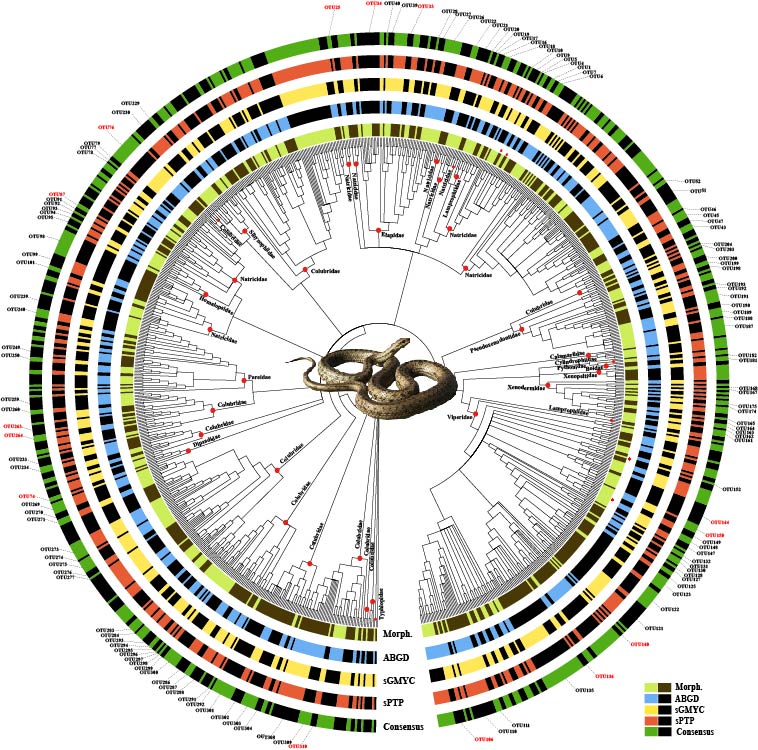 此次,基于系统的野外考察和长期的积累,E乐彩车静研究组,联合国内多家单位科研人员开展了广泛的合作交流,结合NCBI已发表数据,首次系统性构建了中国蛇类DNA条形码参考数据集(COI),对中国蛇类多样性进行了评估。该研究涉及228个已知物种,占已描述物种的80.6%,覆盖了中国大部分区域。