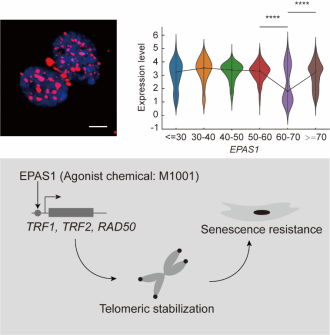 图注:蝙蝠成纤维细胞T-FISH代表性照片,EPAS1基因在人肺内皮细胞中随年龄的表达动态,以及本研究总结。