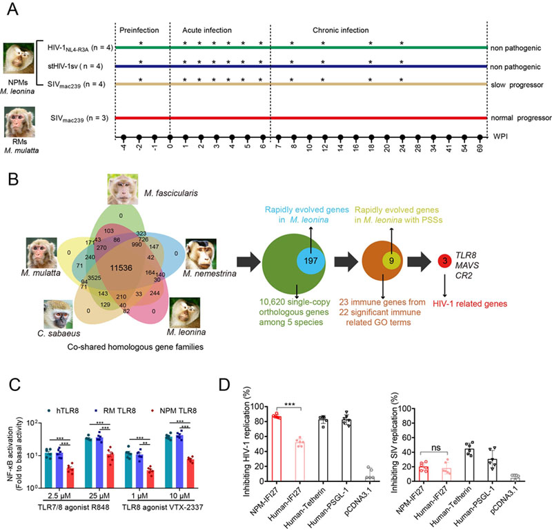 图1. 基于基因组学和感染转录组学研究了北平顶猴HIV-1 持续性感染的免疫调控机制。A)病毒感染动物69周内,HIV-1感染北平顶猴致病不明显,SIV感染北平顶猴致病进程较慢,而SIV感染猕猴致病进程较快。B)比较基因组发现与HIV-1感染相关的北平顶猴基因。 C)北平顶猴TLR8激活炎症反应的能力减弱。D)北平顶猴IFI27特异地抑制HIV-1复制但不抑制SIV复制。