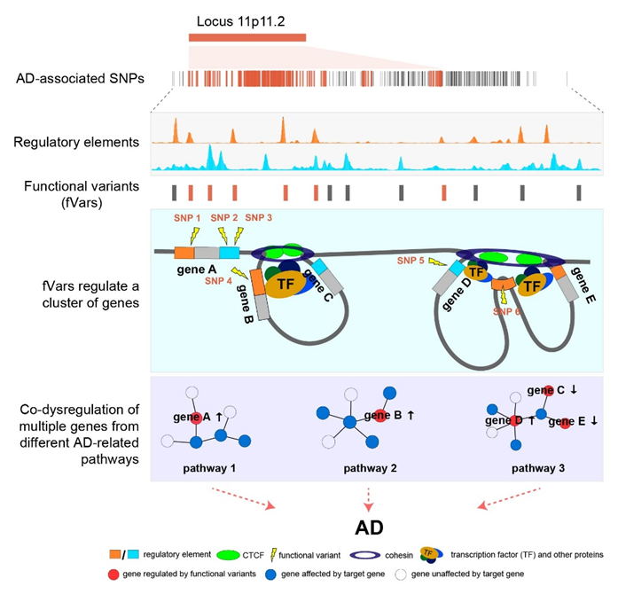 据此,团队提出了11p11.2基因座“多变异-多基因协同贡献AD遗传易感风险”的假说,即一个统计信号提示的风险基因座内有多个功能变异,调控了该基因座内多个基因的表达改变,进而协同贡献于AD的发病风险。这一假说不仅适用于11p11.2,可能同样适用于其他具有复杂连锁和表达调控模式的疾病风险基因座。本研究有望为AD诊治提供新的思路和靶标,同时也为遗传变异贡献于复杂性状的机制研究,尤其是统计模型的开发,提供概念和范式上的创新。