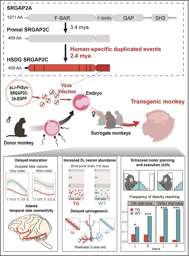 人类作为灵长类中拥有最大脑容量、最复杂大脑沟回的物种,伴随着大脑皮层区域连接特化等一系列大脑进化特征,为人类智慧起源提供了基础。进化上,新基因的出现在新性状的产生中发挥着非常重要的作用。其中,基因片段复制(segmental duplication, SD)是灵长类特别是人类新基因的重要来源。SRGAP2C作为片段复制后产生的人类特异基因拷贝(human-specific duplicated gene, HSDG)一直备受关注。然而,前期的实验和观察都是基于小鼠模型完成的,对于人类大脑的特有表型无法开展有效且系统的验证。