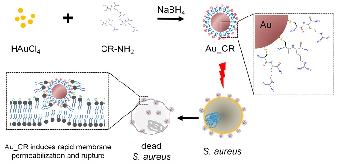 E乐彩赖仞研究员团队长期致力于新型抗菌候选药物分子研发,识别了超过1000个的抗菌肽,其中,一个金环蛇毒来源的抗菌肽已获得国家新药临床批文(批号CXHL1700235,化学药1.1类)。同时,该团队也在天然抗菌肽的基础上进行优化改造(J Med Chem. 2016;Proc Natl Acad Sci U S A. 2019)。近日,该团队设计了仅包含2-3个氨基酸的超短抗菌肽,并通过形成金-硫共价键的方式修饰到金纳米颗粒上,得到了直径约3 nm的多肽修饰的金纳米颗粒(Au_CR)。Au_CR纳米颗粒的形成极大增强了抗菌活性(最小抑菌浓度为10 nM)和稳定性(体内半衰期17.5 h),同时,对金黄色葡萄球菌表现出特异的抑菌作用,主要通过作用于细菌的细胞膜杀死细菌。Au_CR毒副作用小,不易诱导耐药性,综合治疗效果优于万古霉素,具有显著的抗菌候选药物开发特征。