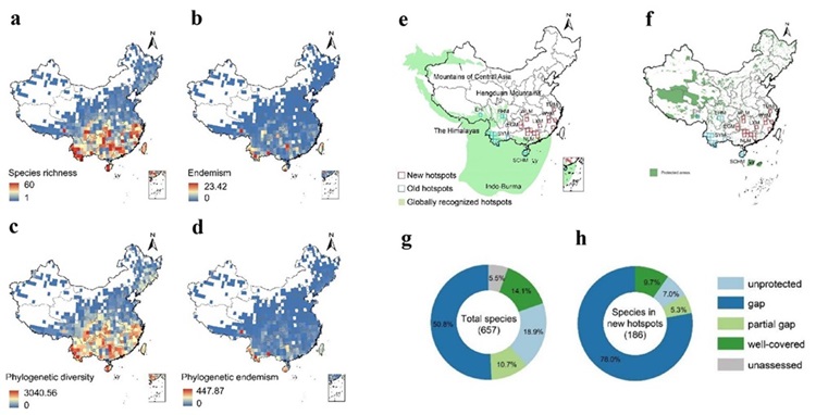 图注:中国两栖类多样性格局和保护空缺。a. 物种多样性;b. 特有性;c. 系统发育多样性,d. 系统发育特有性;e. 中国两栖类热点地区(四个全球已知生物多样性热点区内的栅格以蓝色表示,称为“旧热点”,本研究发现的“新热点”栅格以红色表示);f. 中国保护地分布情况(绿色)& 本研究发现的29个多样性热点栅格(1°×1°)分布格局;g. h. 每个物种地理分布范围受保护地覆盖比例情况。