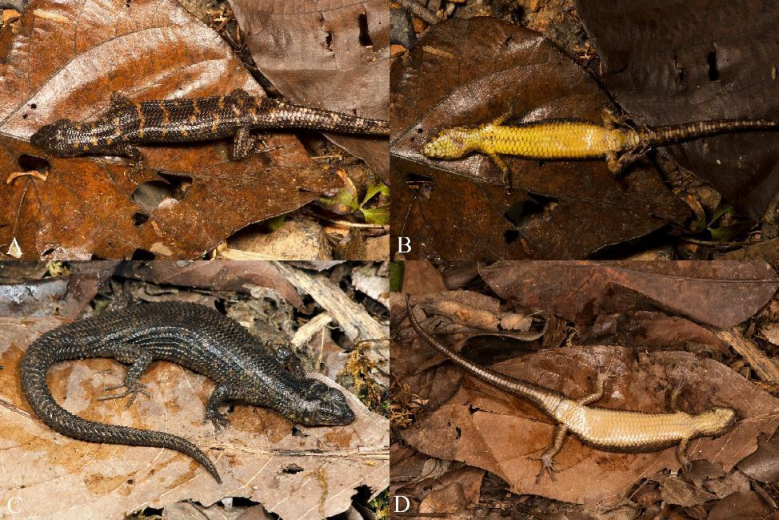 招龙棱蜥模式标本的活体照,A、B展示雄性正模;C、D展示雌性副模;标本保存于E乐彩标本馆。