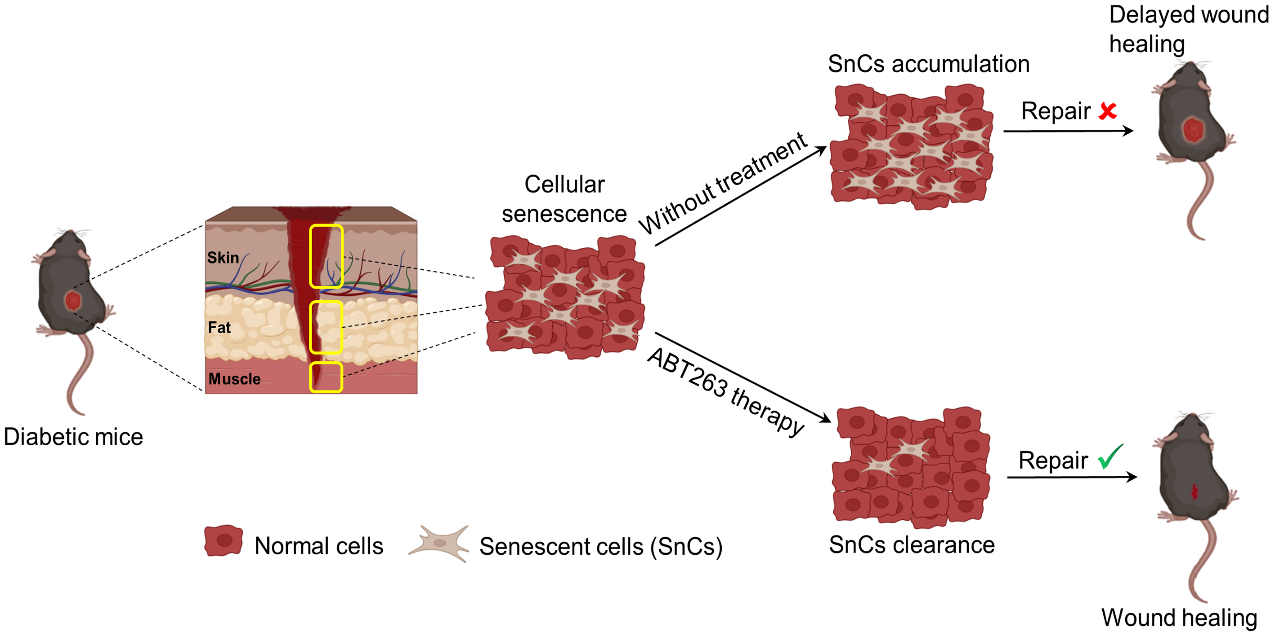 细胞衰老是细胞在受到内外应激条件下发生的不可逆细胞周期阻滞,是个体衰老的重要表现。已有研究证实,急性创伤会诱导细胞应激和衰老,衰老细胞可通过分泌组织因子促进伤口愈合,清除衰老细胞反而阻碍伤口的愈合,但衰老细胞在慢性疾病相关溃疡中的作用并不十分清楚。衰老调控与功能研究学科组通过对临床糖尿病足溃疡患者及年龄匹配的非糖尿病骨折患者的创面皮肤、脂肪和肌肉组织研究发现:糖尿病患者创面的各层组织都有衰老细胞累积,伴随大量细胞衰老相关分泌表型(Senescence-Associated Secretory Phenotype,SASP)因子的产生。进一步的对照和分层研究证实:高血糖是诱导细胞衰老的主要因素,而年龄为次要因素。为了研究衰老细胞对糖尿病创面愈合的作用,研究组以瘦素受体基因突变小鼠(db/db)为对象,采用高脂饲料诱导为2型糖尿病模型,在此基础上创建皮肤创伤模型,发现糖尿病小鼠创口各层组织都出现了衰老细胞的累积,且创口愈合速率显著低于野生型小鼠,这一结果和临床2型糖尿病足溃疡患者的情况高度一致。研究组进一步利用选择性清除衰老细胞的化学小分子(Senolytic)清除衰老细胞后动态监测小鼠创面的愈合情况。出乎意料的是,与急性创面情况(清除衰老细胞阻碍创面愈合)相反,清除糖尿病小鼠的衰老细胞可有效促进创面愈合(图2)。这一结果刷新了衰老细胞对创伤修复作用的传统认知,即在急性创伤中衰老细胞有利于创面愈合,而在慢性创面中衰老细胞的存在反而阻碍创面的修复。这为急性创伤(如烧伤、冻伤、锐器伤、辐射伤等)和慢性溃疡(如糖尿病足、静脉性溃疡、动脉性溃疡、创伤性溃疡、压力性溃疡等)的治疗提供了重要的科学依据和新型治疗策略。