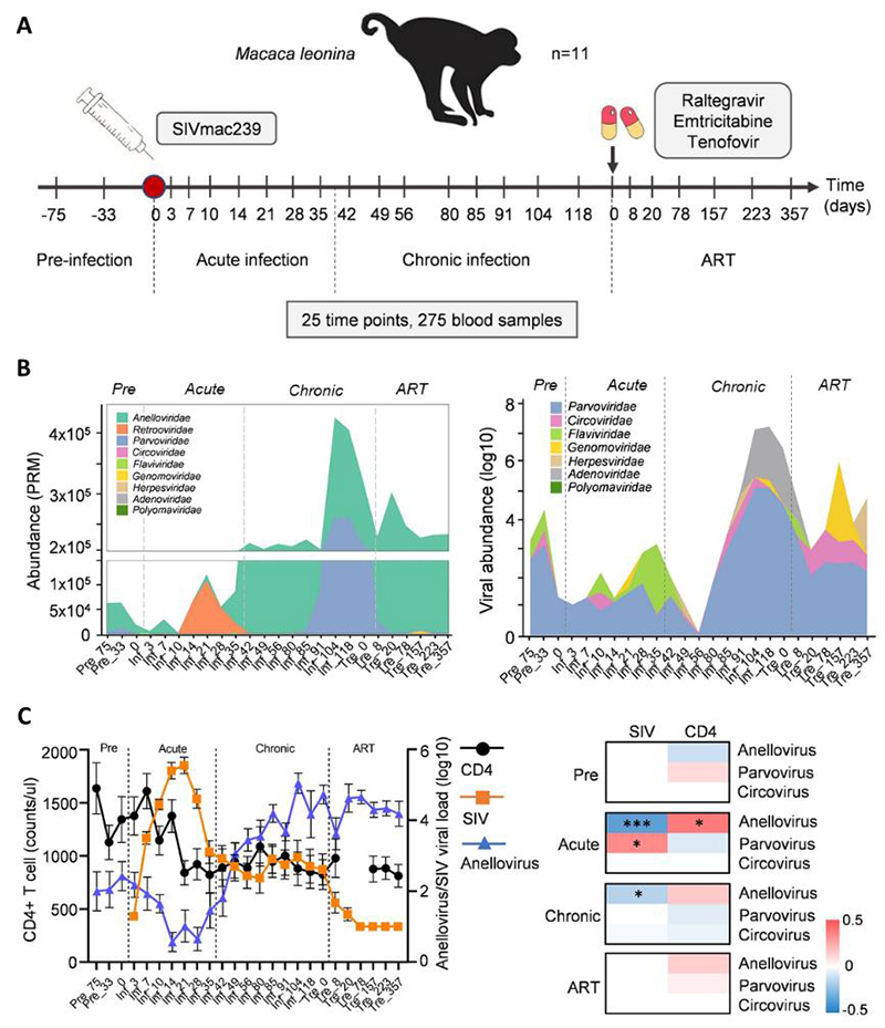 图. SIV感染过程中北平顶猴血液病毒组的演化及作用. (A). SIV感染北平顶猴模型构建;(B). SIV感染过程中血液病毒组的演化;(C). SIV感染过程中,血液指环病毒与SIV和免疫系统的动态关系。