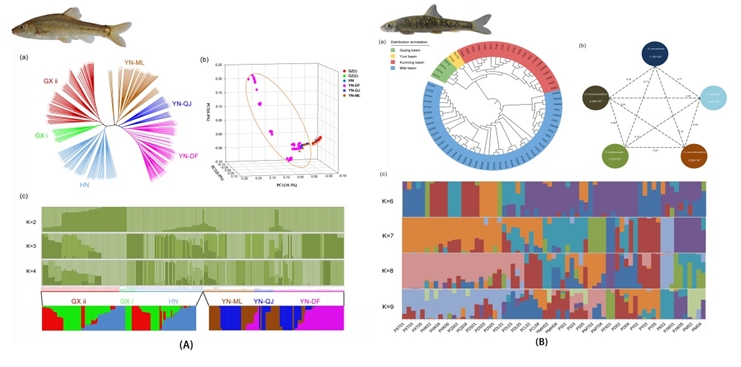 研究成果近日以“Expansion and contraction of lake basin shape the genetic structure of Sinocyclocheilus (Osteichthyes: Cypriniformes: Cyprinidae) populations in Central Yunnan, China”和“Genetic analysis of Discogobio (Cypriniformes: Cyprinidae) in the Central Yunnan Basin: Effects of geological events and conservation perspectives”为题分别发表于Ecology and Evolution (文章链接https://onlinelibrary.wiley.com/doi/10.1002/ece3.10840) 和Zoologica Scripta (文章链接https://onlinelibrary.wiley.com/doi/10.1111/zsc.12673)。E乐彩博士研究生车星锦、助理研究员张源伟为论文共同第一作者,王晓爱正高级工程师为论文通讯作者。研究工作得到云南省科技厅基金、国家自然科学基金、西部之光、中国内陆水域鱼类多样性监测网络、云南省基础研究专项等项目的支持。