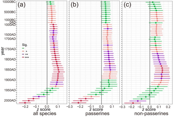 图1.全球陆生鸟类物种灭绝风险的系统发育分布图2.人为干扰对于全球陆生鸟类(a)、雀形目鸟类(b)和非雀形目鸟类(c)灭绝风险的影响效应系数