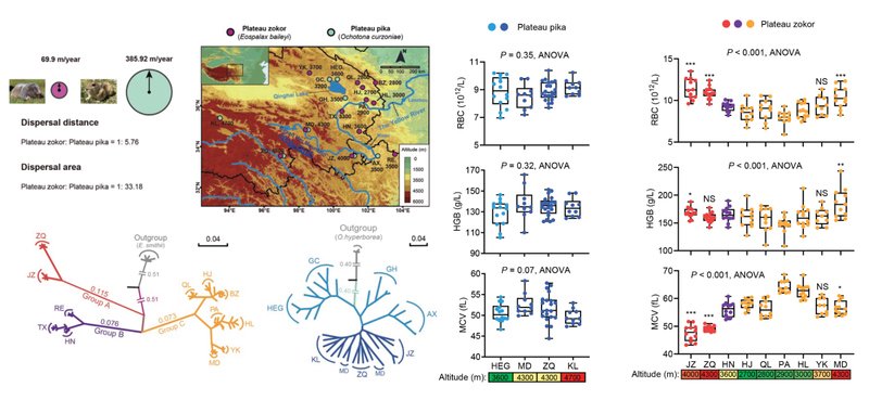 青藏高原被誉为天然的“演化实验室”,其严酷多变的环境为不同栖息地的生物施加了多样且强烈的适应压力。高原鼢鼠与高原鼠兔是该区域常见且占优势的啮齿类动物,二者在高寒草甸中广泛同域分布,并具有相近的高原适应历史。然而,高原鼢鼠为独居、地下生活,繁殖力较弱,扩散能力也明显低于生活在地表、运动能力更强的高原鼠兔。研究团队对12个高原鼢鼠群体与8个高原鼠兔群体进行了群体基因组学分析。结果显示,高原鼢鼠群体表现出显著的地域隔离与遗传分化,而高原鼠兔群体的遗传结构则相对均质。进一步分析发现,高原鼢鼠群体在冰期普遍经历了严重的种群瓶颈,且普遍存在较强的近交压力与遗传负荷。此外,研究团队还采集了两个物种在不同海拔下的心脏与红细胞表型。结果显示,不同海拔的高原鼠兔群体在适应性表型上差异不显著,而高原鼢鼠则随着海拔升高呈现出显著的表型变化。值得注意的是,分布于极高海拔的高原鼢鼠不同遗传支系展现出趋异的适应性表型与遗传机制。