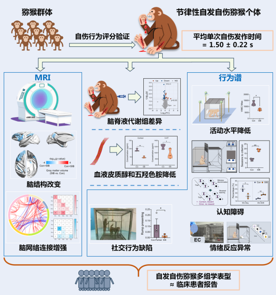 科研人员运用多种技术,对自发自伤猕猴进行了全方位“体检”,包括测量它们的行为,检测血液激素和脑脊液代谢产物,分析大脑影像学。研究人员将这些猕猴的表型与人类NSSI患者的数据进行了比对。