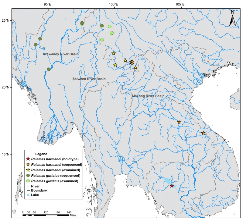 长嘴鱲属(Raiamas)是鿕科中体型最大的鱼类之一,以极长的口裂著称,在亚洲仅有少数物种分布。早在1880年,法国学者Sauvage基于柬埔寨洞里萨湖标本描述了哈氏长嘴鱲(R. harmandi, 原始描述为Bola harmandi),1964年我国学者又在西双版纳采集到7尾标本并命名为大口鱼(Luciosoma fasciata)。但随后,这两个物种均被修订为长嘴鱲(R. guttatus)的同物异名,逐渐被遗忘。