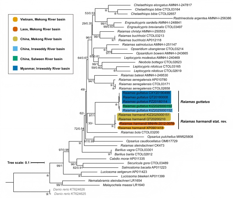 该研究成果以“Forgotten for Decades: Revalidation and Redescription of Raiamas harmandi (Sauvage, 1880) (Cypriniformes: Danionidae) from the Mekong River Basin”为题,发表于国际分类学期刊Taxonomy。昆明动物所博士研究生刘财鑫为第一作者,陈小勇研究员为通讯作者。该研究得到了国家重点研发计划(2024YFF1306700),中国科学院东南亚生物多样性研究中心资助项目(No. Y4ZK111B01),云南省科技厅项目(202403AC100028)和中国科学院分类科学家项目(CAS-TAX-24-054)的支持。