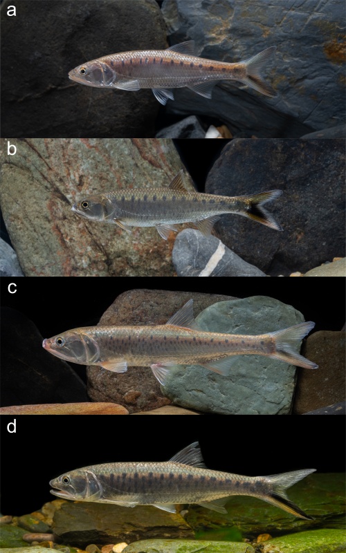图4活体照片:(a)亚成体哈氏长嘴鱲(体长85.0毫米);(b)亚成体长嘴鱲(体长95.0毫米);(c)成体哈氏长嘴鱲(体长176.5毫米);(d)成体长嘴鱲(体长159.2毫米)