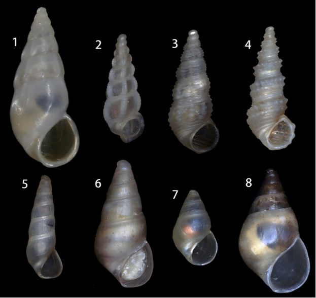 1-8 分别为玻璃昆明螺、铁锏昆明螺、流萤昆明螺、珍珠昆明螺、银匙远岸螺、大池远岸螺、冰糯远岸螺、俞元远岸螺