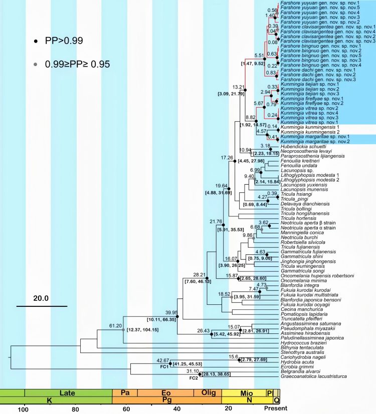 基于四个线粒体和核基因分子标记的最大可信进化分枝树,显示了抚仙湖特有昆明螺属物种和远岸螺属(红色分支)的分化时间