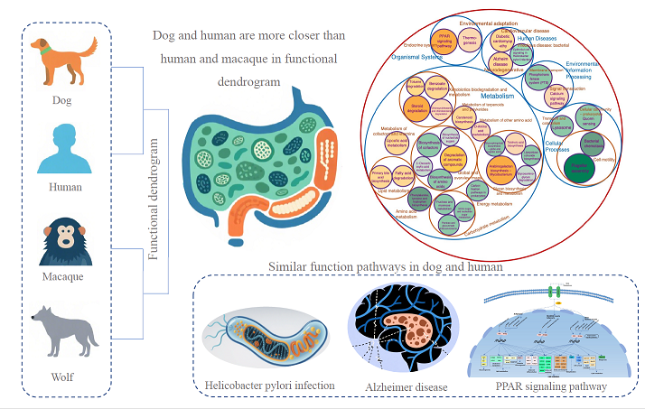 图1.论文示意图。本研究发现家犬与人类的肠道微生物组在功能层面比猕猴和人类更近。值得注意的是,不同生活方式家犬与人类在功能上的重叠区域不同,宠物犬与人类幽门螺杆菌感染(Helicobacter pylori infection)相关的通路有更高重叠,而工作犬肠道菌群功能则与人类糖尿病性心肌疾病(Diabetic cardiomyopathy)和阿尔茨海默病(Alzheimer disease)等代谢性、神经退行性疾病通路存在关联。