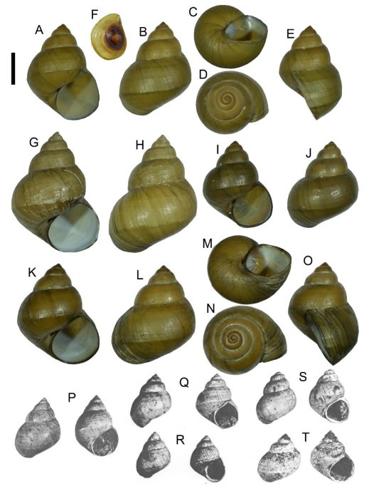 李四光娅田螺的现生个体贝壳(A—O)以及发现于第四纪沉积层的贝壳模式标本(P—T)