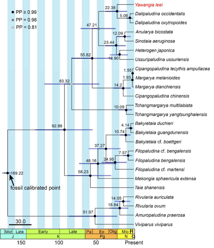 此外,本研究对田螺科下众多物种进行了线粒体基因组测序,所有14种都是首次进行测序。基于线粒体基因组和两个核基因,该研究构建了包含了田螺科16属25种的时间校正的分子系统树。分子系统树研究显示滇中地区特有的玺螺蛳属(Tchangmargarya)是东亚-远东区系田螺的基部类群,而缅甸掸邦特有的泰田螺属(Taia)则是南亚-东南亚区系田螺的基部类群。娅田螺属和理田螺属在中新世早期的约2200万年前分化,此时云南高原部分已经抬升到了和现代相当的海拔高度,两个属的分化应当是由于地理隔离引起并由于对于不同生境的适应(高海拔湖泊/低海拔河流)而加速形成。