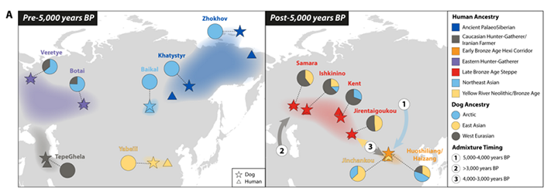 欧亚大陆家犬与人类共迁徙示意图