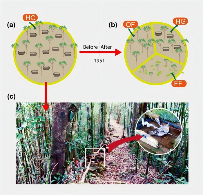 图1 “鸟盆”狩猎的历史变迁示意图和与影像记录。(a)1951年前的传统狩猎场。(b)1951年后祖传狩猎场用途的变化:部分传统狩猎场得以保留(HGs),其余则转为薪柴林(FF)或自然保护区内的成熟林(OF)。(c)狩猎场中用“鸟盆”捕鸟的情景。图中红箭头所指为被“鸟盆”捕获的一只鸟。