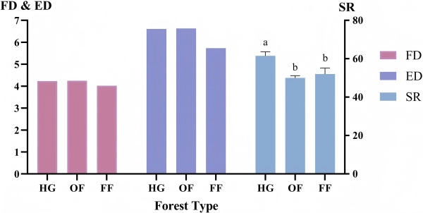 图2 三种森林类型间鸟类群落差异。FD:功能多样性;ED:进化独特性;SR:物种丰富度,FF:薪柴林;HG:狩猎场;OF:原始林。