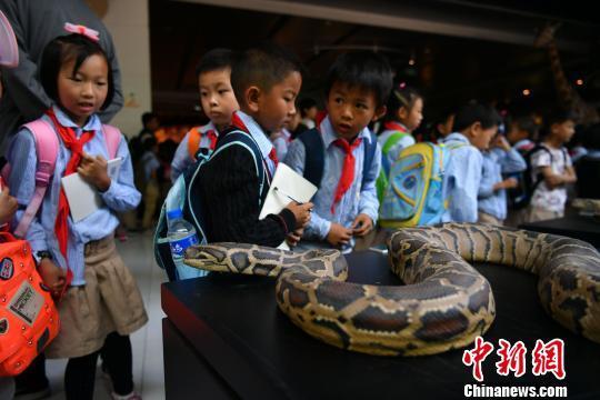 看到眼睛王蛇标本,昆明市西山区阳光小学2年级学生张宸睿忍不住摸了摸蛇头。他告诉记者,平时在城市见到活蛇的机会不多,此次近距离走近它们,了解它们的生活习性,也就没那么害怕了。