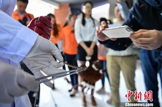 为让民众近距离了解有毒动物,科学家们还现场进行蜈蚣、蝎子取毒。中科院昆明动物研究所副研究员吕秋敏告诉记者,一条5厘米长的蜈蚣,一次仅能取到2微升的毒素,但毒性却很强。