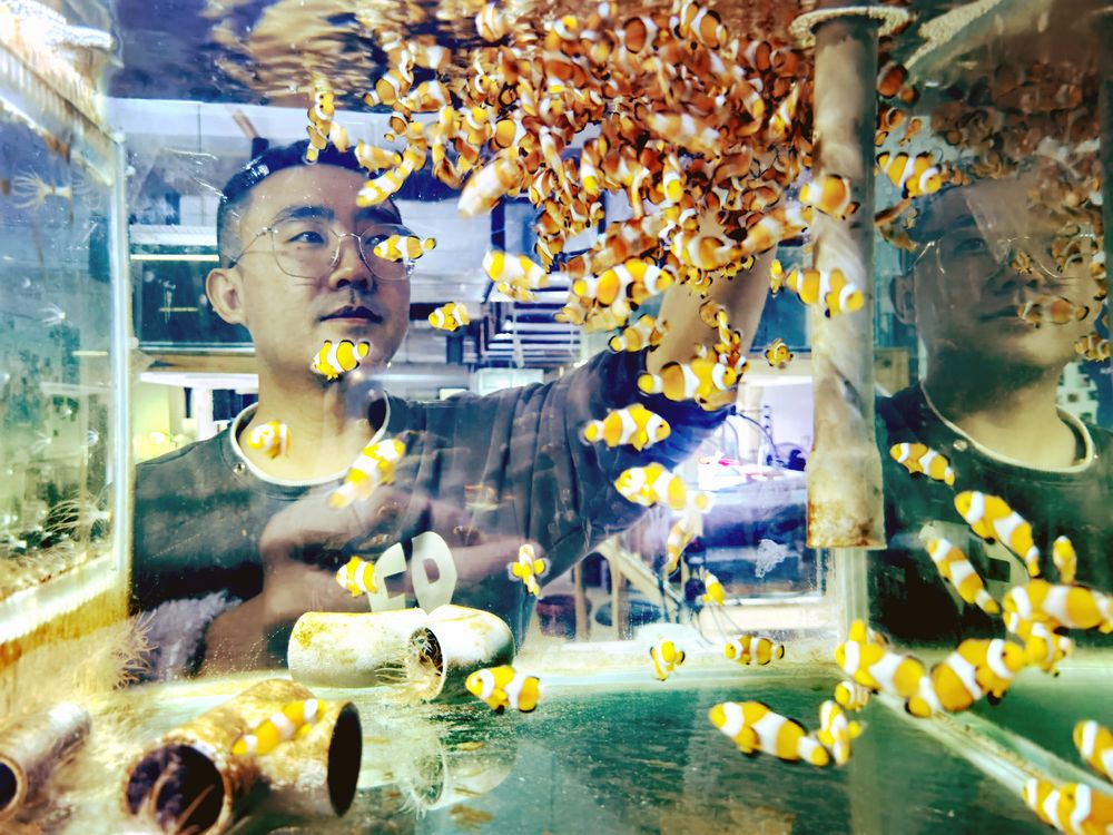 罗杰曾在太平洋里种珊瑚,可可西里拍动物,从海平面以下到海拔5000米以上,都留下了他的科研足迹。而罗杰却说,没有体育锻炼,就没有今天的成绩。罗杰的实验室很像一个水族馆,里面养殖了17个品种的小丑鱼和160多个物种的珊瑚↓