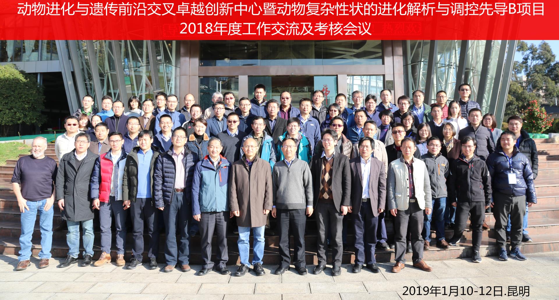 2018年1月10-12日,动物进化与遗传前沿交叉卓越创新中心(以下简称“中心”)暨动物复杂性状的进化解析与调控先导B项目(以下简称“先导项目”)2018年度工作交流及考核会议在昆明顺利召开。中科院副院长暨中心首席科学家张亚平院士,首席科学家魏辅文院士、王文研究员,以及院前沿科学与教育局张永清副局长,中心主任暨依托单位所长姚永刚研究员,中心常务副主任暨依托单位副所长施鹏研究员,依托单位副所长赖仞研究员,以及中心和先导项目成员共计100余人参加会议。