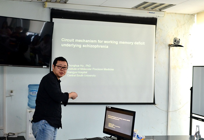 2019年3月17日,应李明研究员和罗雄剑研究员的邀请,中南大学湘雅医院精准分子医学研究所胡中华教授到转化基因学科组和神经精神疾病学科组进行学术交流,并做了题为“Neural circuit mechanism for working memory deficits in schizophrenia “的学术报告。