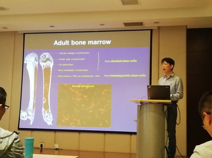 周波研究员主要从事造血干细胞自我更新的研究。为了解造血干细胞的自我更新,他们首先对造血干细胞的微环境做了研究,发现Lepr+细胞是骨髓间充质干细胞的主要成分,会形成骨髓脂肪细胞,分泌SCF因子,而SCF因子对造血干细胞的维持和再生是必需的,通过SCF的谱系示踪,发现了脾脏也具有造血干细胞;然后周波研究员还介绍了造血干细胞自我更新和增殖的分子机制。他们发现造血干细胞的数目在青春期即停止增加,进一步研究发现,雌激素增加会使得造血干细胞的细胞周期更活跃,但不会影响造血干细胞的数目。为进一步找到影响造血干细胞增殖的因子,他们通过基因表达谱研究发现,Lhcgr基因在造血干细胞中高表达,将Lhcgr基因敲除之后,造血干细胞的数目在青春期显著增加,主要影响血液白细胞数,白细胞增加,对生物体并不全是有益的,会加重白血病的发展。