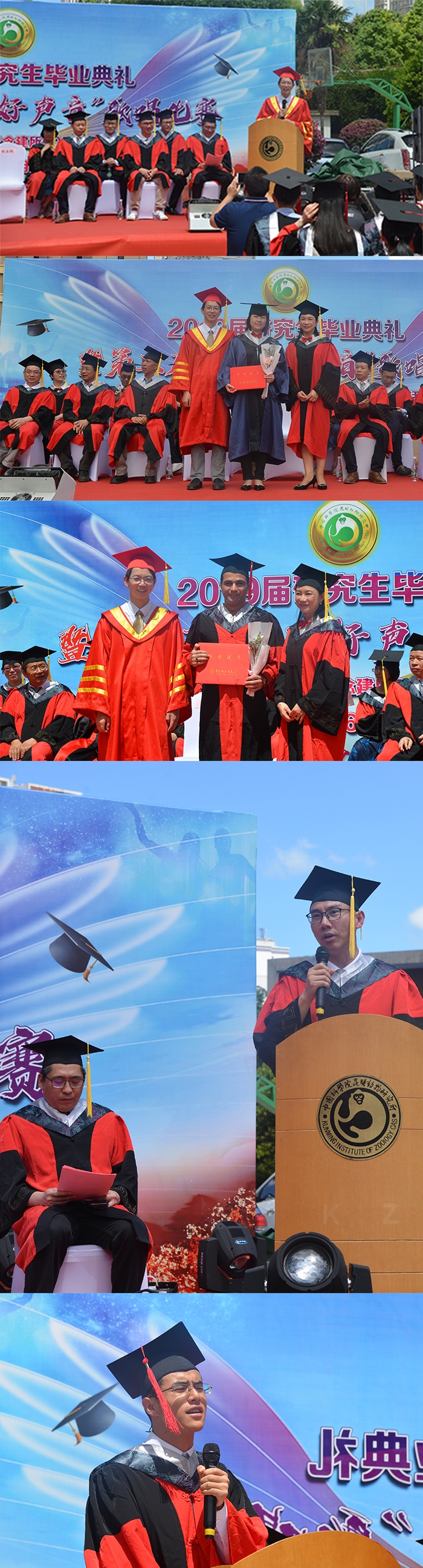 本次毕业典礼在室外举行,导师和毕业生们纷纷在毕业纪念签名墙前合影留念。11时始,导师代表们走过红毯落座主席台,毕业生们也有序走过红毯在台下就坐。国歌奏响后,典礼正式开始,所长姚永刚首先发表致辞,他热烈祝贺72名研究生顺利完成学业,并向辛勤培养各位毕业生的导师以及默默支持他们的家人、亲友表达了崇高的敬意和衷心的感谢。姚永刚所长表示:2019年,中华人民共和国建国70周年,中科院建院70周年,昆明动物研究所建所60周年,是一个具有重大纪念意义的时光。虽然部分毕业生未能参加本次毕业典礼,但他们一定在为创造更精彩的时刻而努力!他说,成就往往离不开奋斗,我们身边的普通人,还有我们熟知的科学家们都在为实现自己的目标而努力奋斗,最后造就了人生的高光时刻。所以我们需要树立自己的目标,并为达成目标不懈努力。姚永刚所长表示:在求学路上一定会有酸甜苦辣,但更有刻骨铭心的成长,希望所有毕业生能够不忘初心,牢记使命,奋发有为,勇于担当,坚持自我,扎实工作,并期待大家能心存鸿鹄之志,化身扶摇直上九万里的鲲鹏。最后,姚永刚所长表示研究所将会永远心系大家。