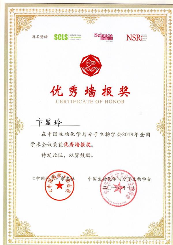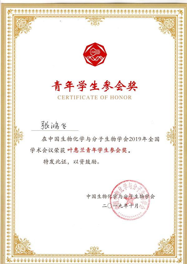 我所云南省生物化学与分子生物学会理事长张云研究员课题组8人参加了本次会议,并精心准备了摘要与墙报。在大会上进行了展示与讲解,经专家评审,我所参会的张鸿飞同学获得叶惠兰青年学生参会奖,卞显玲同学获优秀墙报奖。