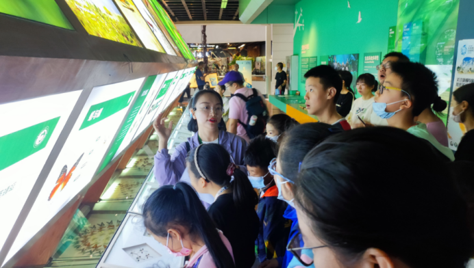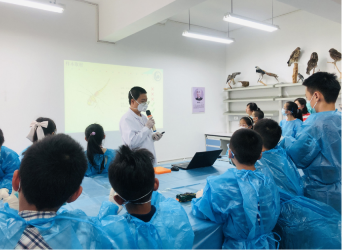 本次课程以“水上舞者—蜻蜓”为主题,由副研究员张浩淼通过对国内蜻蜓分类到基因组研究的前沿科学内容开展了一堂生动有趣的蜻蜓百科内容的科普讲座,通过蜻蜓的分类、中国闻名于世的蜻蜓、蜻蜓的基因组研究目前是通过怎么样的实验完成等方面带着参与的学生对蜻蜓有一个系统的认知。在高级工程师杨劲松的带领下通过远古巨蜻蜓、昆虫世界中的奇妙生存之道、蜻蜓分类等模块开展知识介绍,通过“色彩的天空”、“小脑袋 大智慧”、“枫叶”、“黑色飘带”等蜻蜓标本作品,寻找蜻蜓世界中的美学,一起探索在蜻蜓缤纷色彩中的艺术感。在蜻蜓标本显微镜观察环节,学生将科学课学习的分类学知识通过显微镜的使用及观察了蜻蜓翅脉上的鉴别特征、蜻蜓复眼的特征等在实践中巩固蜻蜓分类学要点。