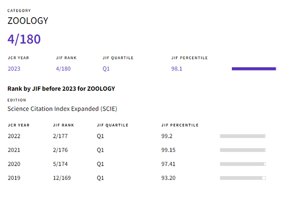 2024年6月20日,科睿唯安发布2023年度《期刊引用报告》(Journal Citation Reports, JCR)。Zoological Research(《动物学研究》(英文版,ZR)获得最新影响因子:4.0,五年影响因子:4.5,在全球180种动物学期刊中排名第4位,位于 JCR 动物学学科Q1分区。