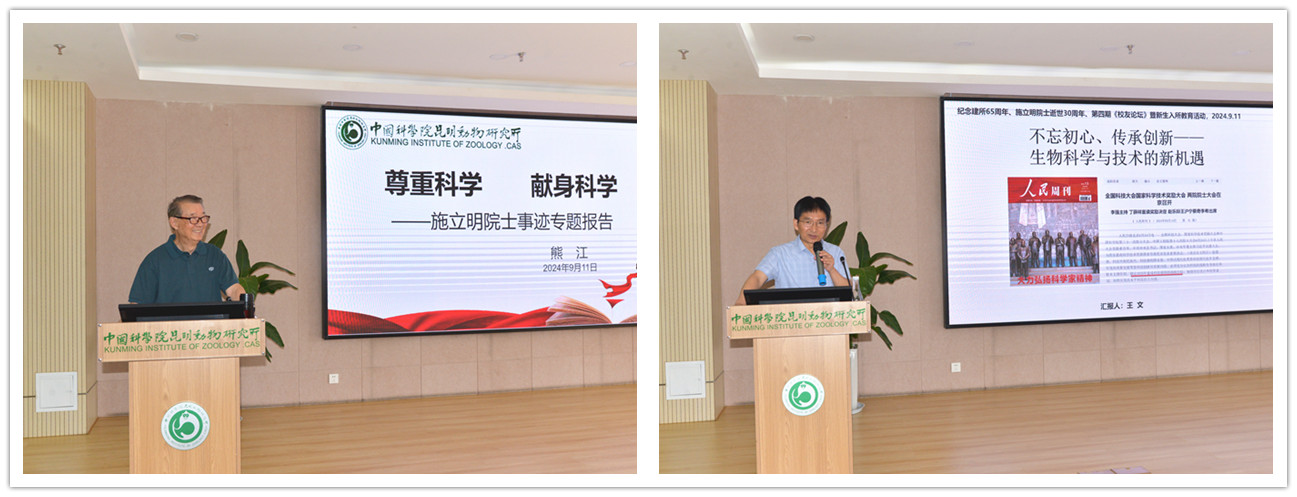 今年适逢研究所建所65周年,遗传学家施立明院士逝世30周年,为缅怀施先生,传承和发扬以施先生为代表的老一辈科学家精神,本次培训会通过校友会邀请了施先生的同事熊江研究员和其学生王文研究员,开展了科学家精神的专题活动。王文作《不忘初心、传承创新——生物科学与技术的新机遇》的专题报告,报告系统总结了所属学科的历史脉络,分享了传承和发展麂属动物染色体演化研究的故事,分析了生命科学和生物技术发展和应用前景,希望研究所的青年人能够抓住时机,在领域内找到兴趣所在,创造属于自己的美好未来。熊江作《尊重科学,献身科学——施立明院士事迹》专题报告,讲述了研究所艰苦奋斗的创业史,体现出施先生等老一辈科学家坚守科学事业初心,为满足国家需求,促进研究所发展而勇于创新、无私奉献的精神。熊老师勉励青年们要以施先生等老一辈科学家为榜样,争做新时代的好青年。