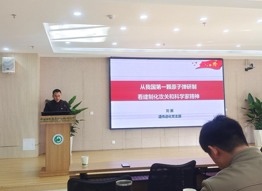 接着,遗传进化党支部书记刘振以《从我国第一颗原子弹研制看建制化攻关和科学家精神》为题讲党课,以我国第一颗原子弹研制成功为例,展现了求真、务实、勇于探索、团结集智的科学家精神,充分证明了“坚持把科技自立自强作为国家发展的战略支撑”具有重要的现实意义。