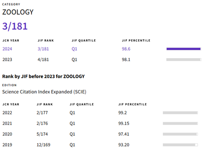 2025年6月18日,科睿唯安发布2024年度《期刊引用报告》(Journal Citation Reports, JCR)。Zoological Research(《动物学研究》(英文版,ZR)获得最新影响因子:4.7,五年影响因子:4.7,在全球181种动物学期刊中排名第3位,位于JCR动物学学科Q1分区。Journal Citation indicator排名,ZR位于182种期刊的第3名。