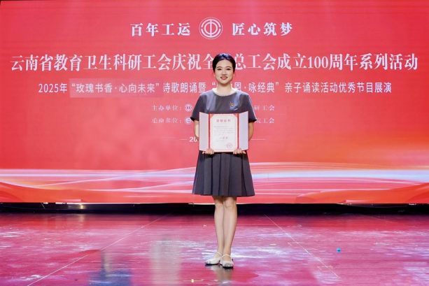 7月15日-7月17日,由云南省教育卫生科研工会主办的2025年度“玫瑰书香·心向未来”诗歌朗诵暨“颂党恩·咏经典”亲子诵读决赛暨展演、颁奖活动在五华区青少年宫举行。E乐彩工会选送黄小彧原创的诗朗诵作品《科学时代的云南答卷》和禹晓梅的亲子诵读作品《我的国,我的家》参加决赛。本次赛事教卫科工会共征集到200余份作品,初选后,共有70余个作品进入决赛。经过现场激烈角逐,最终评选出一等奖11个,二等奖18个,三等奖20个,黄小彧原创的诗歌朗诵作品《科学时代的云南答卷》荣获诗歌朗诵一等奖。