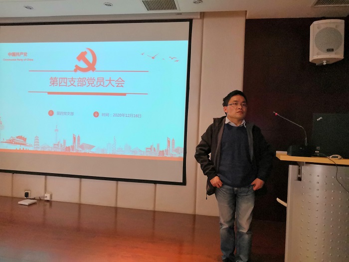 全面学习党的十九届五中全会精神后,第四党支部支部书记盛能印组织本支部党员、积极分子等召开了支部大会。会上,首先讨论了支部接收袁佳妙同志为预备党员事项,按照讨论流程,与会党员进行了投票表决,全票通过了袁佳妙同志转为预备党员的决议。然后,支部副书记朱玮璟通报了支部2020年党费的收支情况、支部组成及党员发展情况,总结了2020年支部“三会一课”落实及主题党日开展情况,并指出了本年度支部工作开展存在的问题和不足。最后,支部书记盛能印结合2020年度支部工作总结内容,提出了2021年支部工作计划,强调下一年度的支部建设应融入科研,支部工作应结合实际开展多元化的活动,切实落实“三会一课”制度,把学习贯彻党的会议精神与推进全所各项重点工作结合起来。
