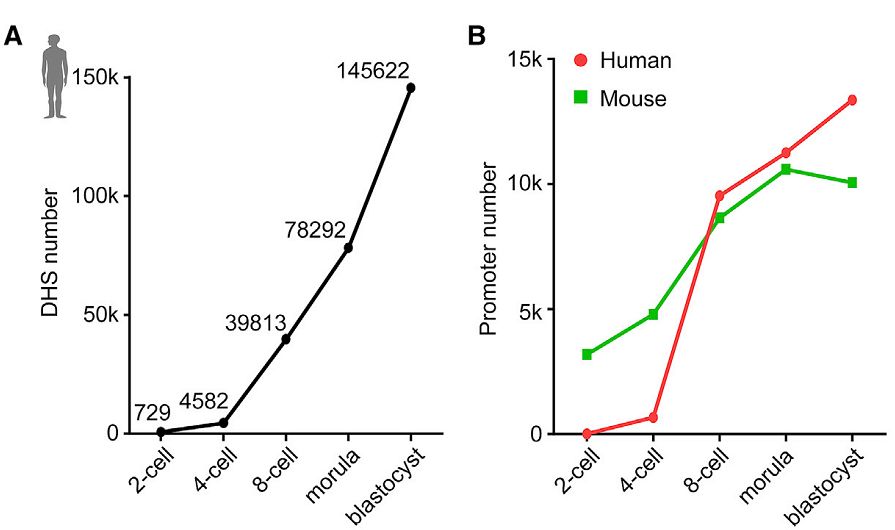 中科院动物进化与遗传前沿交叉卓越创新中心刘江研究员及其团队与国内多家科研机构合作,首次发现人类早期胚胎发育过程中染色质开放性逐步建立的过程,并特别指出人类胚胎合子基因组激活(zygotic genome activation,ZGA)过程中转录因子OCT4是必须的而小鼠中则是非必需。同时,该研究还从发育进化的角度来理解人类早期胚胎发育中基因和转座子的表达调控,具有重要的意义。该研究所获人早期胚胎发育染色质调控动态图谱在相关研究中有里程碑的意义,为今后对早期胚胎发育研究提供了海量的调控动态信息。与其他物种相关研究一起将有力的推动对个体生命起始以及生命程序展开的认识。研究成果于2018年3月9日发表于国际顶级学术期刊Cell上。 (A)DNase I超敏感位点在人类早期胚胎发育各阶段数量(B)启动子在人类和小鼠各胚胎发育阶段数量