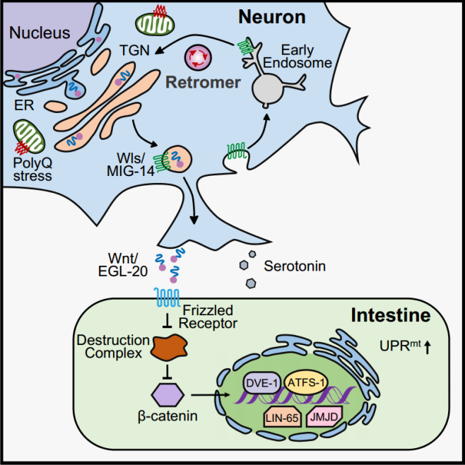 | 发现Retromer介导的Wnt信号通路参与调控神经到肠道细胞之间线粒体应激反应的通讯 |