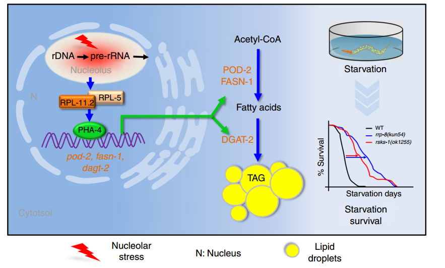 中科院动物进化与遗传前沿交叉卓越创新中心梁斌研究团队利用秀丽线虫全基因组遗传筛选优势,发现rrp-8基因突变后出现脂滴显著增大、脂肪过多积累。RRP-8主要是参与rRNA的前处理加工,其突变后导致核糖体合成受到明显的抑制。进一步研究发现,和rrp-8基因突变体表型类似,无论是利用抗霉素D(Actinomycin D)抑制rDNA转录,还是pro-2/pro-3等参与rRNA加工处理的突变体线虫,都出现脂滴增大和脂肪过多积累,表明核仁应激改变能量代谢、导致脂肪积累。该研究新发现了一种细胞器应激和脂代谢相关,即核仁应激激活转录因子PHA-4/FoxA,上调脂肪合成,把能量转为脂肪储存,为人类核糖体代谢相关疾病、以及肥胖和肥胖相关代谢性疾病提供了新的研究思路。该研究成果发表在NatureCommunications上。同时,该研究工作得到中科院先导专项(B)、卓越中心、国家自然科学基金委、云南省高端科技人才、云南省中青年学术后备人才等项目资助。该研究成果分别被新浪网、中科院、云南省科学技术厅等多家报道。