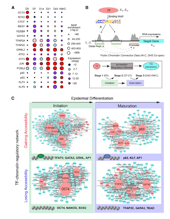 (左):基于干细胞分化过程的转录因子-可及调控元件-靶基因三元组的网络推断模型;(右):表皮角质细胞分化起始和成熟阶段的调控网络。 这项研究得到中科院B类先导专项、国家自然基金委的经费资助。中科院数学与系统科学研究院的研究生都仁扎那、信晶雪、陈浪参与了数据建模与计算。 |