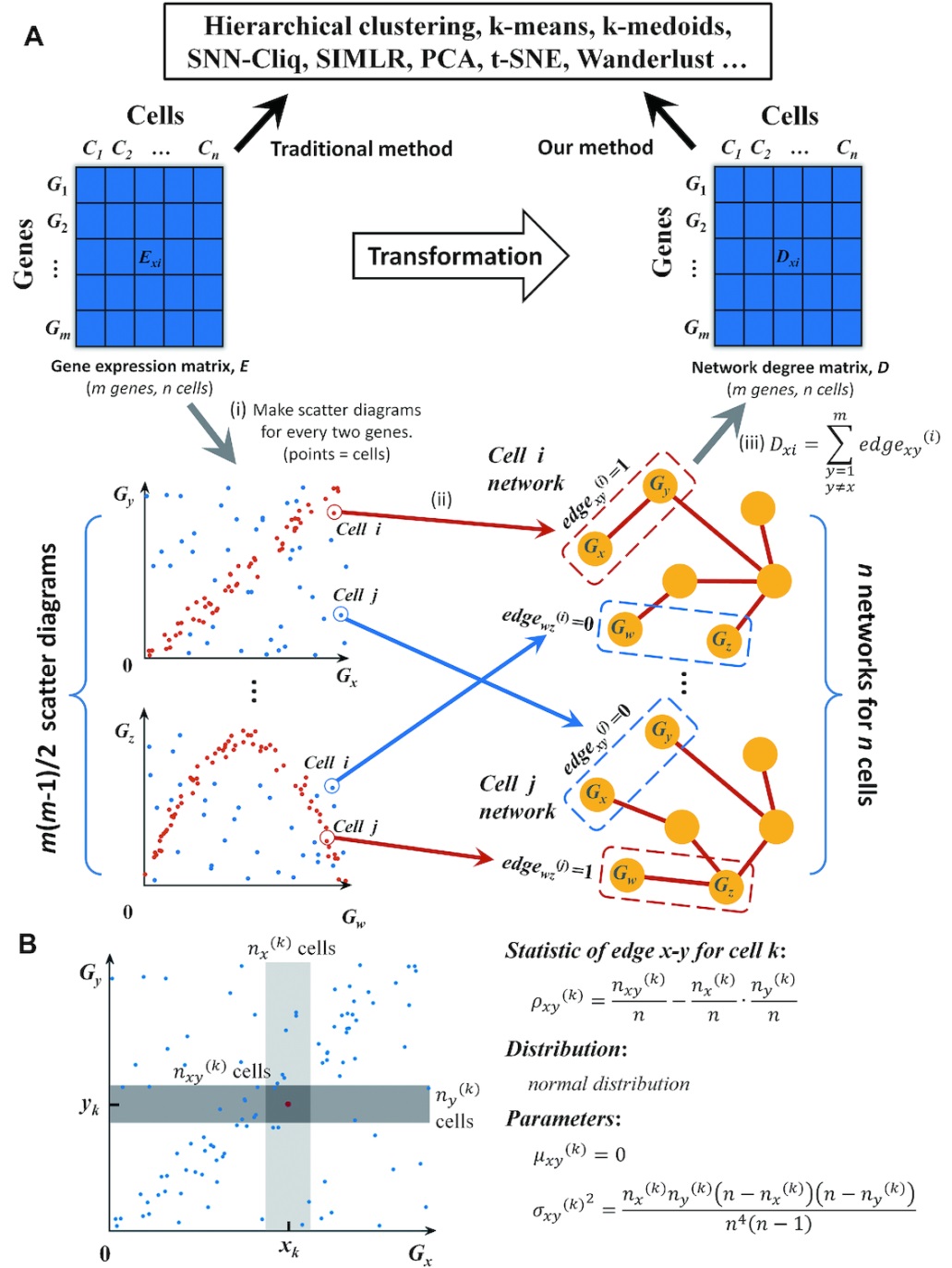 2019年3月13日,国际学术期刊《Nucleic Acids Research》在线发表了中心陈洛南研究组题为“Cell-specific network constructed by single-cell RNA sequencing data”的最新研究成果。该成果首次提出从单细胞转录组数据(scRNA-seq)为每个单细胞构建一个基因关联网络(CSN: Cell-specific network)的理论和方法,使我们第一次能够在单细胞分辨率水平上识别基因之间的相互关联(网络)。利用该方法,可以从网络的角度对scRNA-seq数据进行聚类和拟轨迹分析,为scRNA-seq数据分析开辟了新的途径,并且,该方法还能够发现在网络层面起重要作用但通常被传统的差异表达分析所忽略的“暗”基因,其准确性和鲁棒性在多个scRNA-seq公开数据集中得到验证。 单细胞转录组测序提供了一种高通量方法来测量和比较在单细胞分辨率水平下的基因表达水平,从而揭示了细胞之间的异质性和功能多样性,帮助发现具有独特功能的新细胞类型。而基于单细胞数据中庞大的样本量,理论上我们还可以从这些数据中构建基因关联网络,并在更深层次发现隐含的基因调控关系的变化规律。