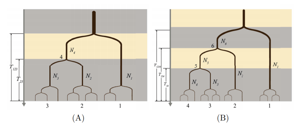 比较基因组学是从进化角度分析不同物种的基因组数据,解析基因功能和疾病、表型的遗传学机制。通过同源基因编码区序列的进化比较是其中最常见的分析方法之一,如PAML等方法,都在物种序列比较分析中被广泛应用。但这些方法仅分析多个物种的单一序列和分歧位点信息。随着二代、三代测序技术的发展,众多物种的基因组测序都已完成,越来越多的物种都在种内水平有了多个样本的群体基因组数据。如果能将多物种群体水平的遗传多态和物种水平的进化相结合进行分析,将有助于解析物种(尤其是近缘种)产生过程中适应性进化和特有表型形成的机制。迄今为止,尚且缺乏此类方法。 中心陈华研究组与中心依托单位昆明动物所合作,首次开发了能够同时分析多个物种的群体基因组数据的方法HDMKPRF。该方法以Hartl、Bustamante等的泊松随机场模型和McDonald-Kreitman检验为框架,通过多个物种的联合等位基因频谱理论构建群体遗传学模型,有效整合了微进化过程与宏观进化。与现有分析方法比较,该方法采用贝叶斯方法,很大程度提高了对自然选择基因的检测功效;通过多个物种的群体基因组比较分析,能够有效把自然选择发生时间定位在多物种进化树的具体某个阶段(分支)上。该方法还提供了对各个物种的群体大小、物种分化时间以及自然选择强度等参数的后验概率分布。