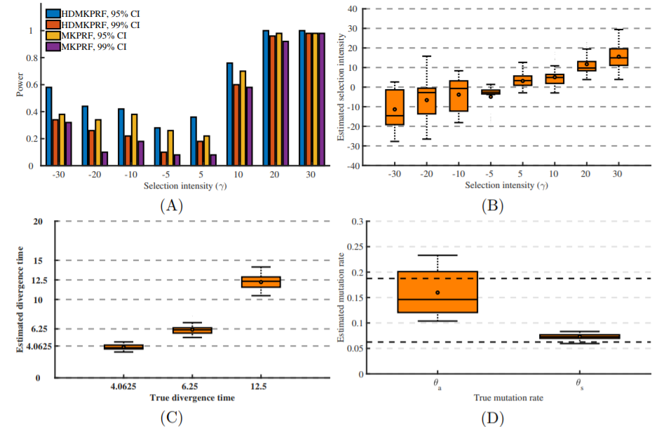 图(二)应用电脑仿真对HDMKPRF在检测功效、对分歧时间、选择强度等参数推断上进行性能检验。 利用该方法,研究人员对现代人、黑猩猩、大猩猩和猩猩四个灵长类物种基因组数据做了分析,在各个物种中鉴定了受到自然选择而快速进化的基因。发现在人的特异性进化中,有84个与表达调控相关的基因受到正选择,广泛分布在锌指蛋白基因家族、小RNA调节通路、TP调控、组蛋白修饰基因等不同类型中,印证了进化学家Allan Wilson和Mary-Claire King在1975年提出的观点,即基因调控是人与黑猩猩在99%基因组序列相似基础上表型高度差异的主要因素之一。发现与免疫、代谢等相关的通路受到了正选择。此外,有大量的现代人与其他大猿分歧的基因富集在精神分裂症、神经系统疾病相关的通路上,部分快速进化基因集中在精子生成、生殖相关通路上。该分析提供了灵长类四类大猿进化在时间轴和基因组上的自然选择图谱,为后续的进一步功能解析研究提供了基础。 该研究于3月6日在线发表在进化生物学期刊《分子生物学与进化》上(https://doi.org/10.1093/molbev/msz046)。中心参建单位北京基因组研究所精准基因组医学重点实验室研究生赵石磊与依托单位昆明动物研究所遗传资源与进化国家重点实验室研究生张涛为该文章的共同第一作者,陈华研究员为该文章通讯作者,中心施鹏研究员和宿兵研究员参与共同指导了该项目。研究得到了国家自然科学基金委重大研究计划“微进化过程的多基因作用机制”、中科院院先导专项“动物复杂性状的进化解析与调控”等项目支持。 |