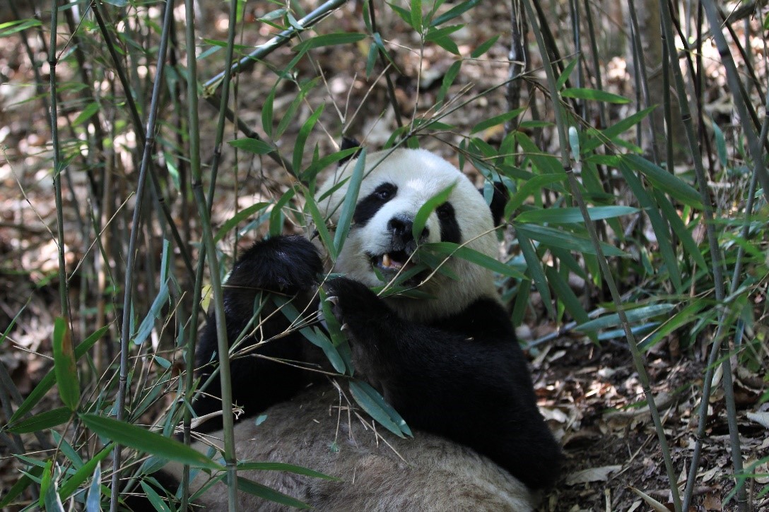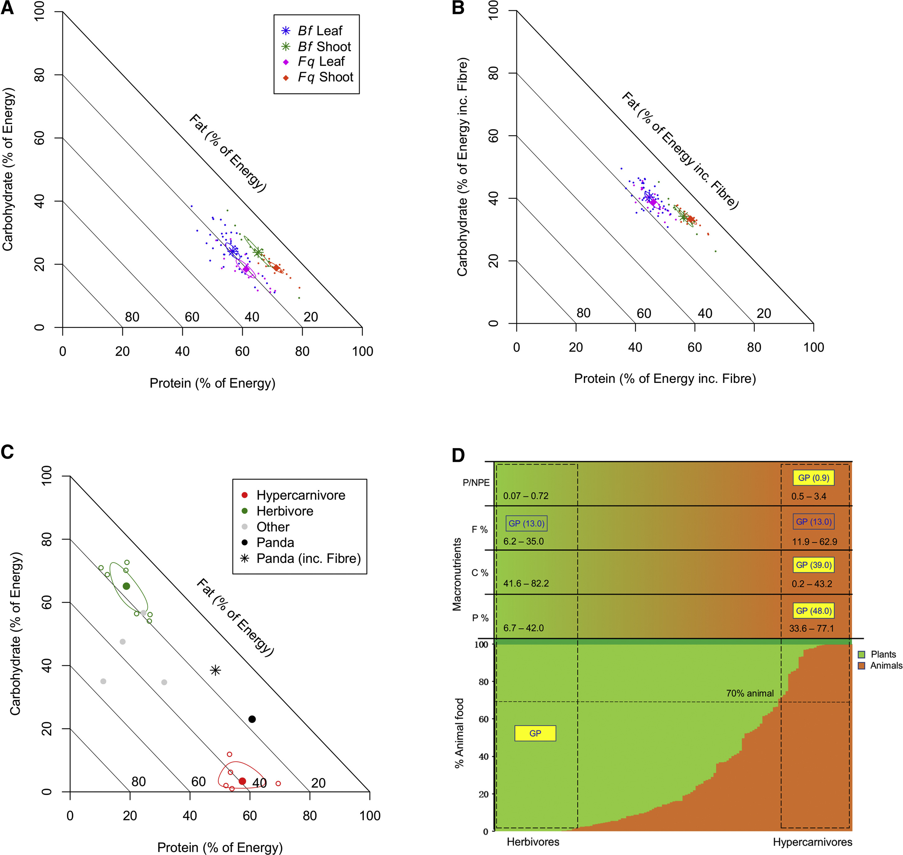 图1. 野生大熊猫觅食行为 关于动物觅食策略有很多理论和假说,如能量最大化理论、蛋白质最大化理论等等,这些理论和假说多关注于某一类营养物质对动物觅食策略的影响,而越来越多的研究表明,食物中各类营养物质的组成对动物的觅食选择具有重要作用。近年来,在这一理论基础上发展创建的几何营养模型,为揭示野生动物的觅食策略和营养需求之间的关系,以及动物对食物资源的生态适应性提供了新的思路和方法。以此为背景,近期又有关于营养生态位理论的研究认为,传统的根据食物类型的划分可能会产生一些误差,由于动物的许多生态学特征和功能主要由食物中的营养物质决定,而在食物水平和营养水平的划分上可能会出现不一致的情况。 那么,对大熊猫特化的植食性和其食肉动物的解剖及生理属性之间的这种看似相互矛盾的特征的解释,是否可能存在于其特化的食物之中,竹子对其而言到底是一类怎样的食物? 为探讨这一问题,魏辅文研究组基于上述理论模型框架,对生活在我国秦岭地区野生大熊猫的觅食和营养利用策略进行了长期的跟踪研究,发现大熊猫主要根据区域内两种主食竹的物候特征,进行季节性迁移觅食;几何营养模型分析显示,与其它哺乳动物相比,其全年取食食物的营养组成比(能量比)与食肉动物的更为接近,蛋白质为其提供了一半左右的能量来源,这显著有别于其它植食性动物;相对消化率的分析结果表明,这种相似性也体现在营养物质的利用策略上;进一步对大熊猫与其它类群哺乳动物的乳汁营养物质组成比进行比较,也显示其与食肉动物的相似性特征。